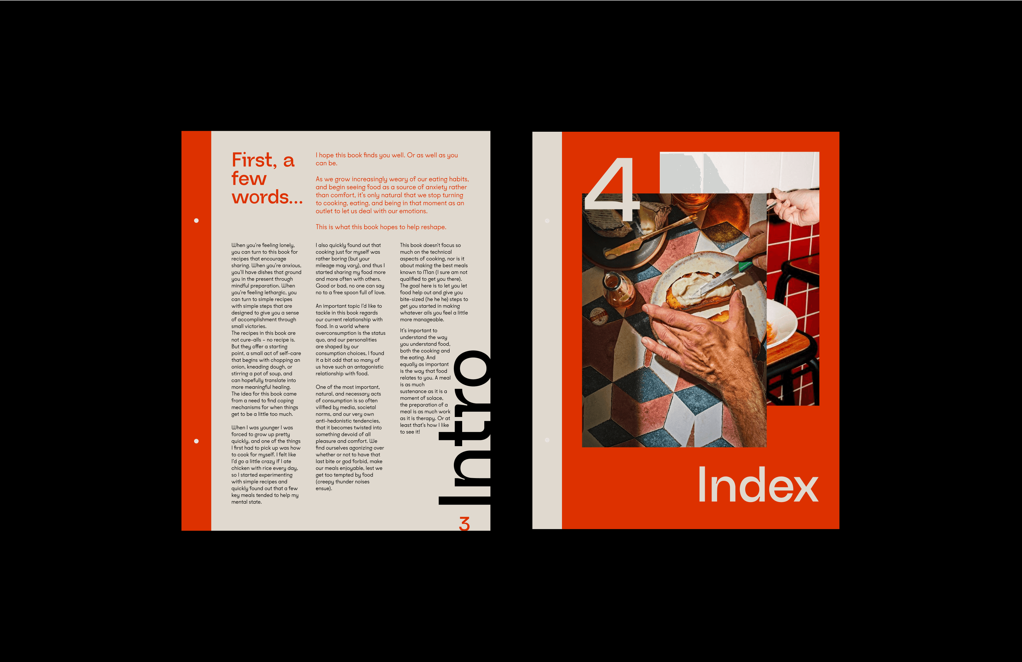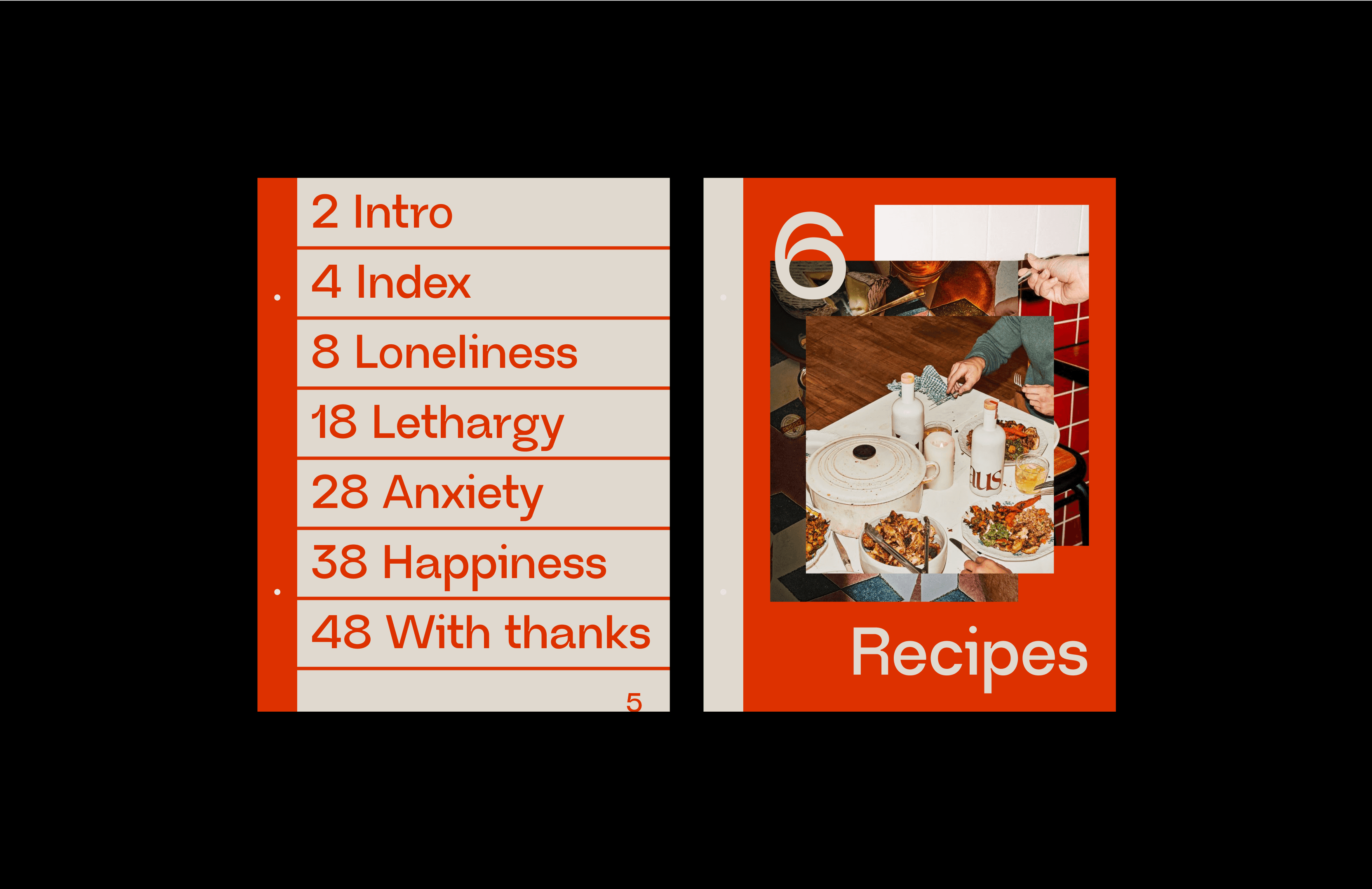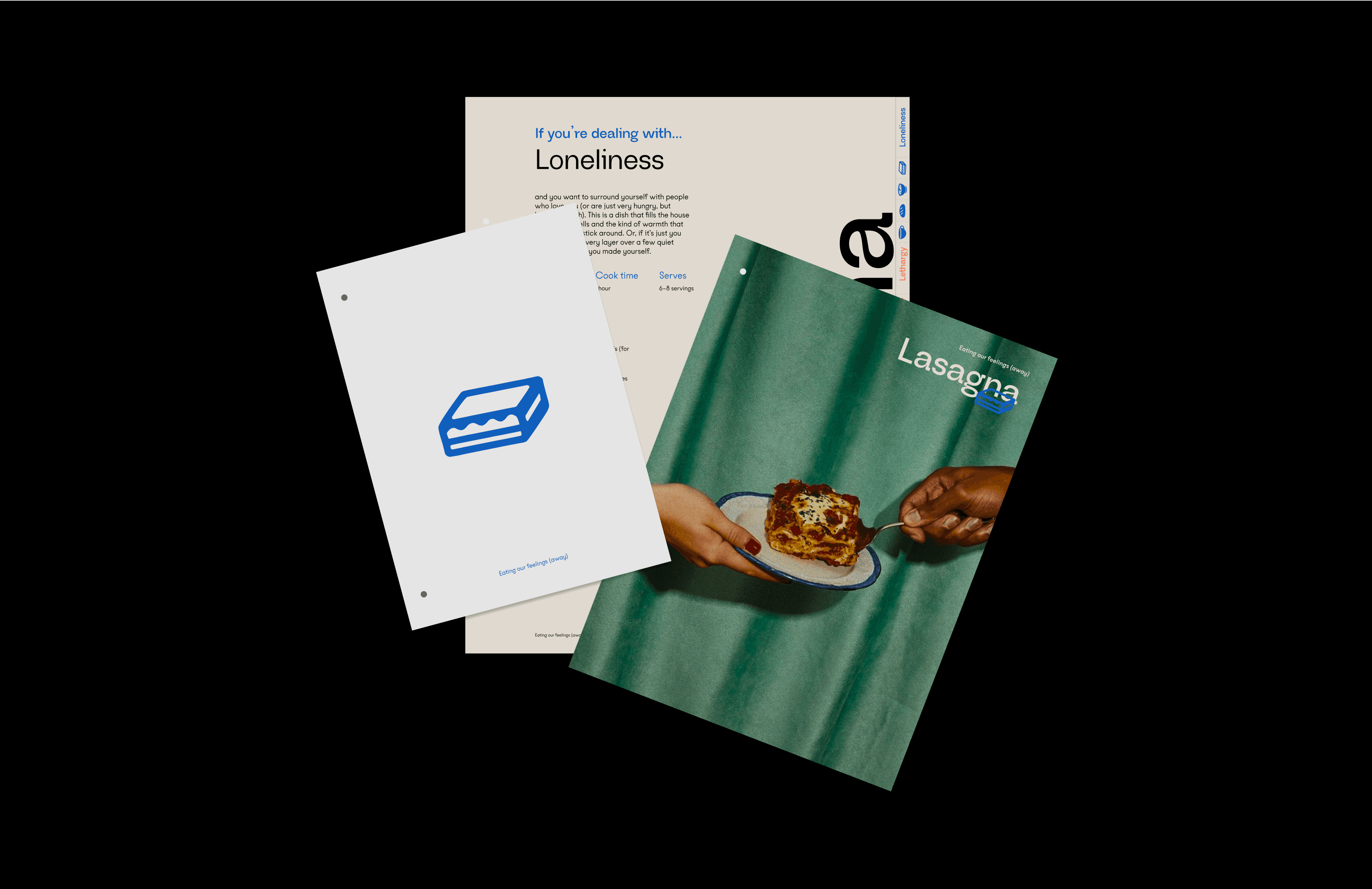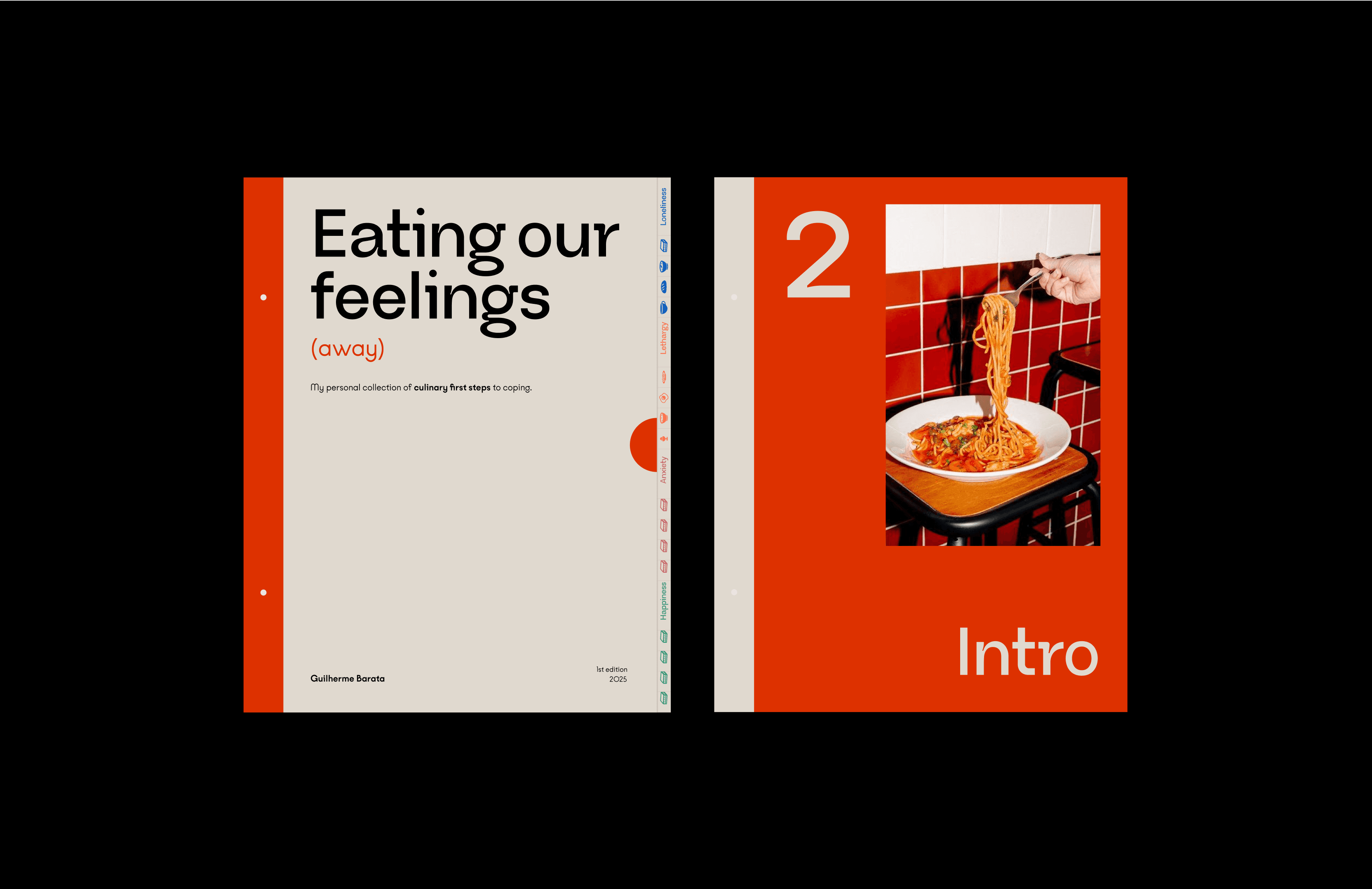 Visually, the project draws from modern editorial design, combining bold colors, Swiss-style grids, and clean, expressive typography with warm photography and playful layout choices. Each emotional chapter—Loneliness, Lethargy, Anxiety, and Happiness—has its own color-coded system, giving the reader visual cues for mood and tone. These choices aren’t just aesthetic—they’re intentional, helping anchor the emotional atmosphere of each recipe before a single word is read.