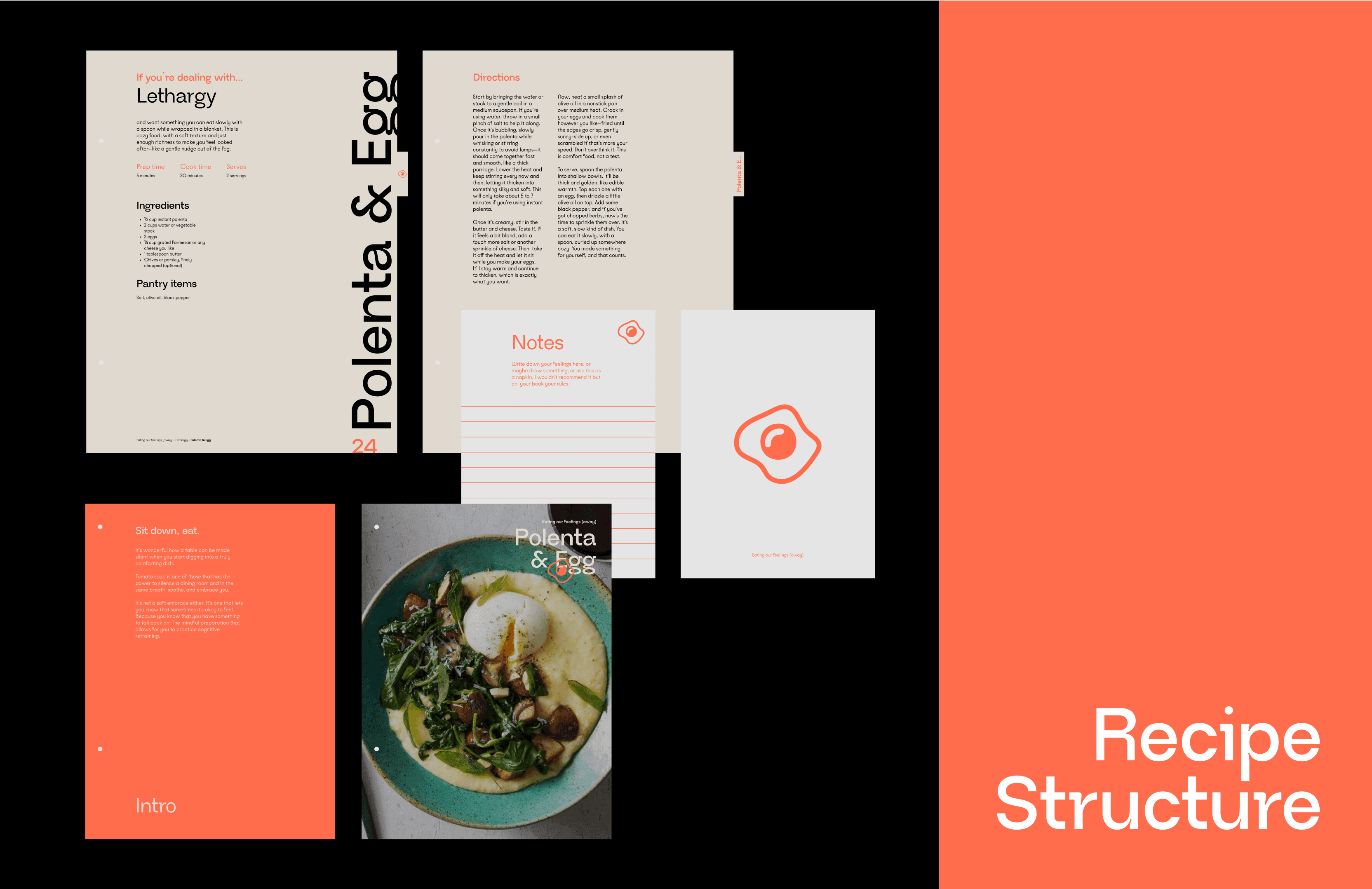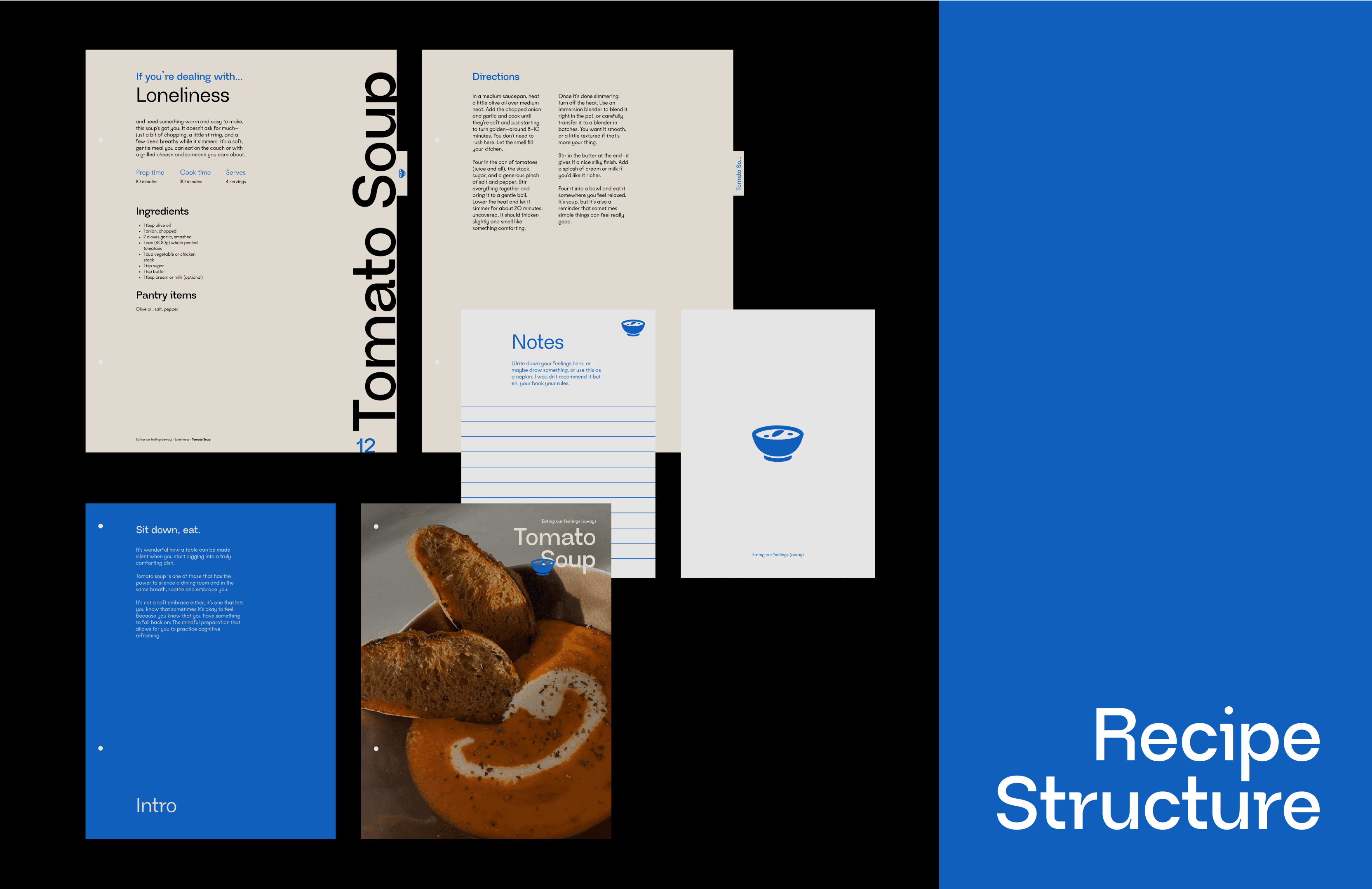 The heart of the format lies in the modularity: each recipe is treated as its own booklet. These individual booklets contain three key elements—first, a short, poetic intro that gently frames the recipe in the context of its emotion; second, the recipe itself, written in a friendly and supportive tone; and finally, a blank note page inviting the reader to write, reflect, or adapt the dish to their own needs. The design encourages interaction and ownership, treating cooking as a creative act of emotional grounding.
